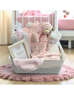 Esta completa canastilla para bebé recién nacido incluye una suave manta para bebé, un tierno dou dou con nombre, biberón, chupete, chupetero, 6 pañales, gasas, gorro y babero, todo cuidadosamente seleccionado para ofrecer un regalo bonito, funcional y lleno de encanto. Cada elemento aporta utilidad en el día a día del bebé y convierte esta canastilla de nacimiento personalizada en un detalle muy especial para la familia.