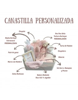 La manta bebé personalizada aporta suavidad y confort, perfecta para acompañar al bebé en sus primeros momentos. El dou dou para bebé es un complemento delicado y agradable, ideal como compañero de descanso. El biberón, el chupete y el chupetero forman un conjunto muy práctico para el día a día, mientras que los 6 pañales y las gasas añaden ese toque útil que toda canastilla para recién nacido debe tener. El gorro y el babero completan el conjunto con un acabado adorable y funcional.
