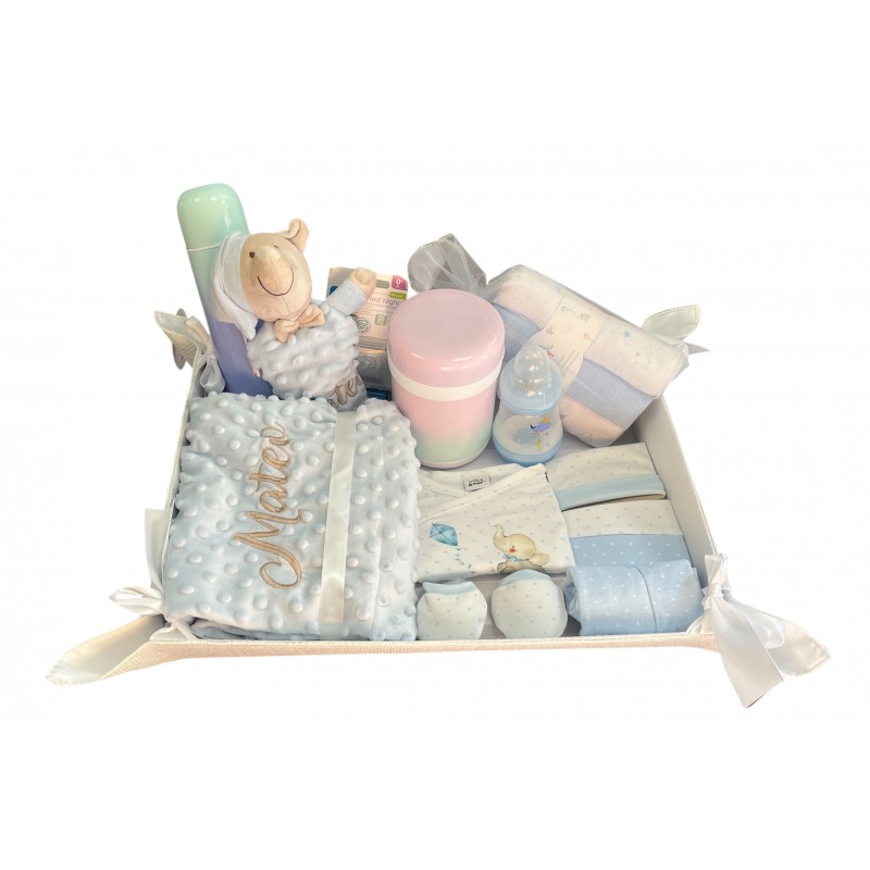 Este pack premium destaca por su gran utilidad a largo plazo al incorporar un biberón anticólicos y dos termos (para líquidos y sólidos), esenciales para las salidas en familia. Se completa con un chupete, tres gasas de algodón y una elegante cesta de regalo, uniendo diseño y máxima funcionalidad en un solo detalle inolvidable.