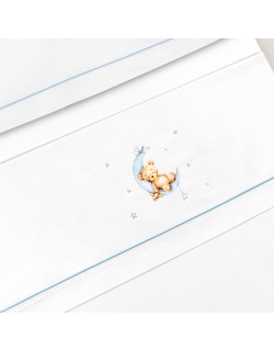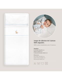 Las sábanas de cuna Oso Luna Estrella de Interbaby son 100 % algodón y están compuestas de 3 piezas, sábana bajera, encimera y funda de almohada.Las medidas son 60 x 120 cm. Presentadas en caja de cartón con ventana transparente.